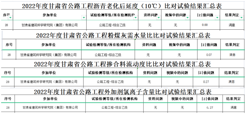 2022年12月12日,甘肅省交通建設質(zhì)量安全造價中心公布了《關(guān)于甘肅省2022年公路工程試驗檢測機構(gòu)及工地試驗室比對試驗結(jié)果的通報》,甘肅建科院市政公路專業(yè)事業(yè)部參加的各項比對試驗均獲得“滿意”結(jié)果。