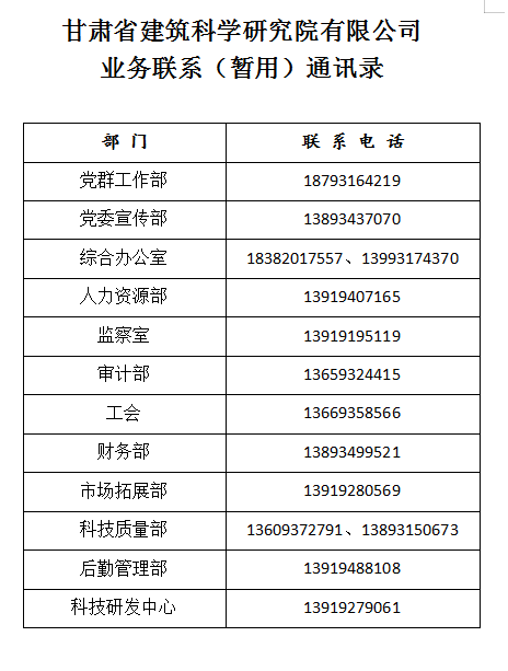 因搬遷,近期公共電話還不能使用,為不耽誤業(yè)務工作,方便工作的開展,將暫時使用以下通訊錄。