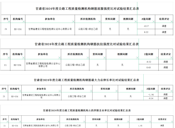 2024年12月31日甘肅省交通建設(shè)質(zhì)量造價中心公布了2024年度公路工程試驗檢測機構(gòu)及工地試驗室比對試驗結(jié)果,甘肅建科院再獲佳績。鋼筋屈服強度、抗拉強度、最大力總伸長率、重量偏差、土的界限含水率(液限和塑限聯(lián)合測定法)五項檢測參數(shù)均取得滿意結(jié)果。