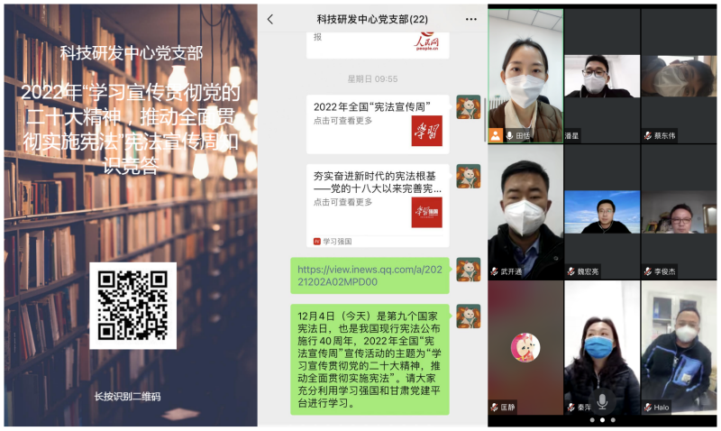 12月7日,檢測(cè)中心第一黨支部開(kāi)展了“學(xué)習(xí)宣傳貫徹黨的二十大精神,推動(dòng)全面貫徹實(shí)施憲法”主題黨日專項(xiàng)活動(dòng),通過(guò)深入學(xué)習(xí)貫徹習(xí)近平總書(shū)記全面依法治國(guó)新理念、觀看憲法知識(shí)視頻、在辦公區(qū)域張貼標(biāo)語(yǔ)以及憲法知識(shí)競(jìng)賽答題活動(dòng)等形式,推進(jìn)憲法宣傳教育,進(jìn)一步推動(dòng)憲法知識(shí)入腦入心,激發(fā)了職工學(xué)法的積極性和守法的自覺(jué)性。