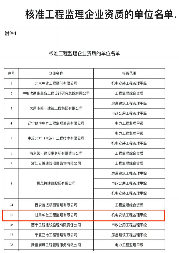 2023年新年伊始,甘肅建科院全資子公司華蘭工程監(jiān)理有限公司近日成功取得住房和城鄉(xiāng)建設部頒發(fā)的機電安裝工程監(jiān)理甲級資質(zhì)。