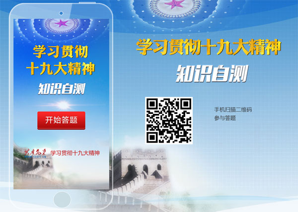 網(wǎng)友可登錄共產(chǎn)黨員網(wǎng)首頁,進入“學(xué)習(xí)貫徹十九大精神知識自測”專區(qū)進行答題,或者通過手機掃描二維碼參與答題。