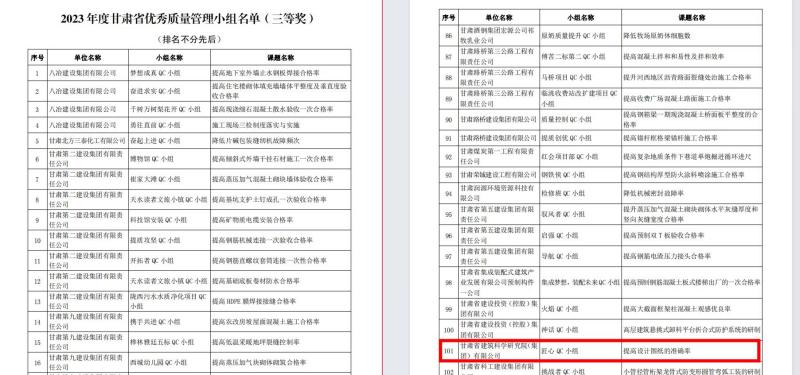 近日,在甘肅省第43次質(zhì)量管理小組活動年會暨成果交流會上,由甘肅建科院設(shè)計分院申報的2023年度甘肅省優(yōu)秀質(zhì)量管理小組活動課題“提高設(shè)計圖紙的準(zhǔn)確率”獲得省級三等獎。