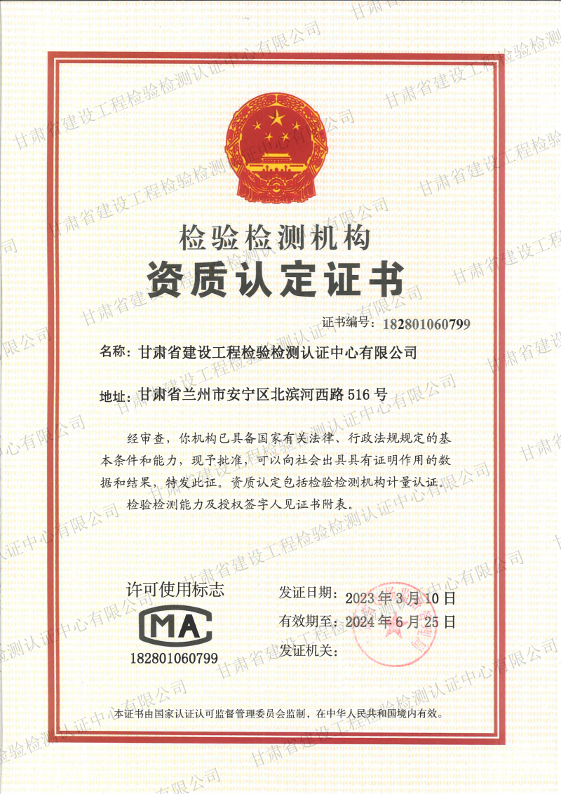 近年來,甘肅建科院以提升核心競爭力為導向,以強化戰(zhàn)略管理、優(yōu)化產(chǎn)業(yè)板塊、完善激勵約束為抓手,聚焦重點難點,補齊短板弱項,堅持檢驗檢測、咨詢服務、特種施工、產(chǎn)業(yè)產(chǎn)品并行的“1+N”發(fā)展模式,提升了企業(yè)的核心動能。成立建設工程檢驗檢測認證中心公司是做精檢測、做優(yōu)服務的重要措施之一。該公司已獲得甘肅省市場監(jiān)督管理局核準頒發(fā)的檢驗檢測機構(gòu)資質(zhì)認定證書和甘肅省住房和城鄉(xiāng)建設廳頒發(fā)的建設工程質(zhì)量檢測機構(gòu)資質(zhì)證書。