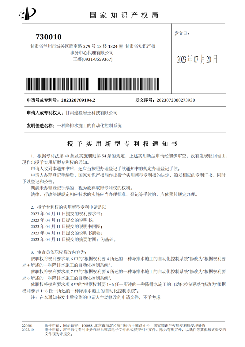 近日,由建投巖土科技公司申報的“一種既有基坑頂部裂縫變形的快速監(jiān)測預(yù)警裝置”和“一種降排水施工的自動化控制系統(tǒng)”兩項實用新型專利喜獲國家知識產(chǎn)權(quán)局授權(quán)。
