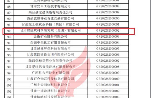 近日,高新技術(shù)企業(yè)認(rèn)定管理工作網(wǎng)發(fā)布公告,公布了甘肅省認(rèn)定機(jī)構(gòu)2022年認(rèn)定的第一批高新技術(shù)企業(yè)進(jìn)行備案名單。甘肅建科院榜上有名,順利通過(guò)高新技術(shù)企業(yè)復(fù)評(píng)。