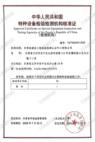 近日,甘肅建科院檢驗(yàn)檢測認(rèn)證中心公司順利通過評審,取得了“特種設(shè)備檢驗(yàn)檢測機(jī)構(gòu)核準(zhǔn)證”,標(biāo)志著公司在鋼結(jié)構(gòu)工程質(zhì)量檢測領(lǐng)域邁出了堅(jiān)實(shí)的一步,實(shí)現(xiàn)了技術(shù)實(shí)力與服務(wù)水平的雙重飛躍。
