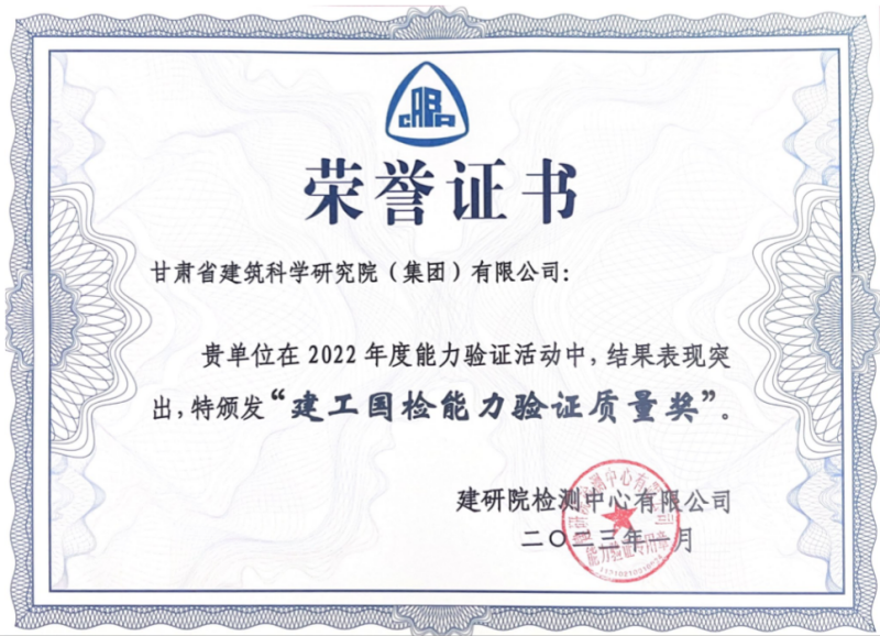 近日,甘肅建科院榮獲由中國建筑科學(xué)研究院建筑工程檢測中心頒發(fā)的“建工國檢能力驗證質(zhì)量獎”。