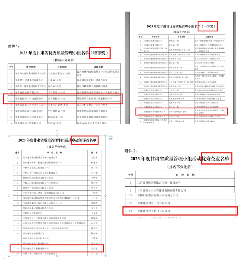 近日,2023年度“甘肅省質(zhì)量管理小組活動成果獎”揭曉,建投巖土科技公司被評為“2023年度甘肅省質(zhì)量管理小組活動優(yōu)秀企業(yè)”,2項QC活動成果取得優(yōu)異成績,其中《降低基坑支護混凝土噴射機損壞率》課題榮獲省級特等獎,《提高含水紅膠泥地層中旋噴樁一次性成樁合格率》課題榮獲省級一等獎?!皫r土科技QC小組”自成立來已連續(xù)三年榮獲QC活動成果省級特等獎、一等獎,兩位小組成員分獲“2023年度甘肅省質(zhì)量管理小組活動卓越領(lǐng)導(dǎo)者”和“2023年度甘肅省質(zhì)量管理小組活動優(yōu)秀推進者”榮譽。