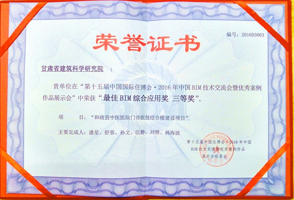 甘肅省建筑科學(xué)研究院參加了本次第十五屆中國住博會(huì)·2016年中國BIM技術(shù)交流會(huì)大賽。本次大賽主要分為兩個(gè)階段:第一階段,項(xiàng)目模型網(wǎng)絡(luò)投票,本階段占最終分值的30%;第二階段,項(xiàng)目模型實(shí)際檢測,評委組專家通過對實(shí)際模型檢測及評估得出相應(yīng)的分值,本階段占最終分值的70%。甘肅省建筑科學(xué)研究院科技研發(fā)中心BIM小組申報(bào)的《和政縣中醫(yī)醫(yī)院門診醫(yī)技綜合樓建設(shè)項(xiàng)目》獲得了此次大賽綜合應(yīng)用組的最佳BIM綜合應(yīng)用三等獎(jiǎng),這是第十五屆中國住博會(huì)·2016年中國BIM技術(shù)交流會(huì)甘肅省獲得的唯一一個(gè)獎(jiǎng)項(xiàng),對甘肅省建筑科學(xué)研究院在BIM領(lǐng)域的發(fā)展意義重大、機(jī)會(huì)彌足珍貴。