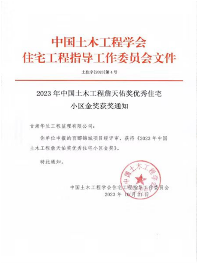 近日,從中國(guó)土木工程學(xué)會(huì)住宅工程指導(dǎo)委員會(huì)傳來(lái)喜訊,由甘肅華蘭工程監(jiān)理有限公司參與建設(shè)的成都百酈錦城項(xiàng)目榮獲“2023中國(guó)土木工程詹天佑獎(jiǎng)優(yōu)秀住宅小區(qū)金獎(jiǎng)”。