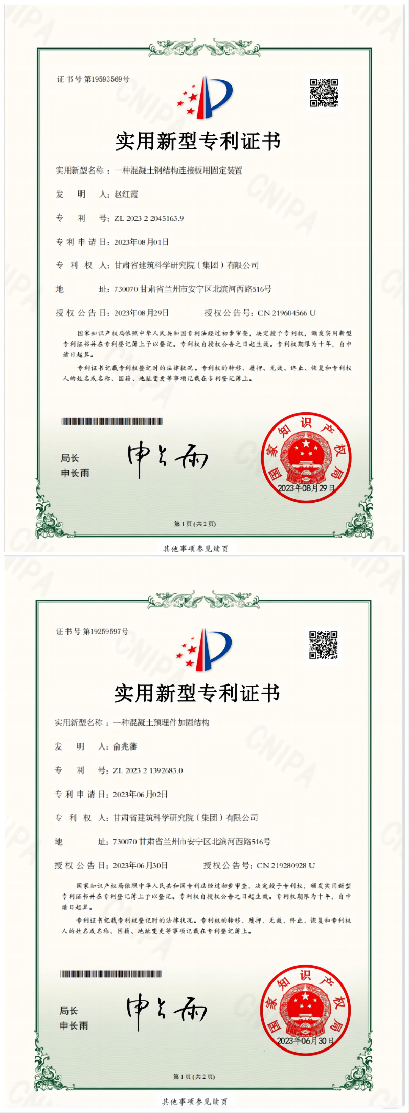 兩項實用新型專利分別涉及鋼改造技術和結構加固預埋件連接技術,有利于實現安裝成本的節(jié)約和提高預埋深度的準確性。
