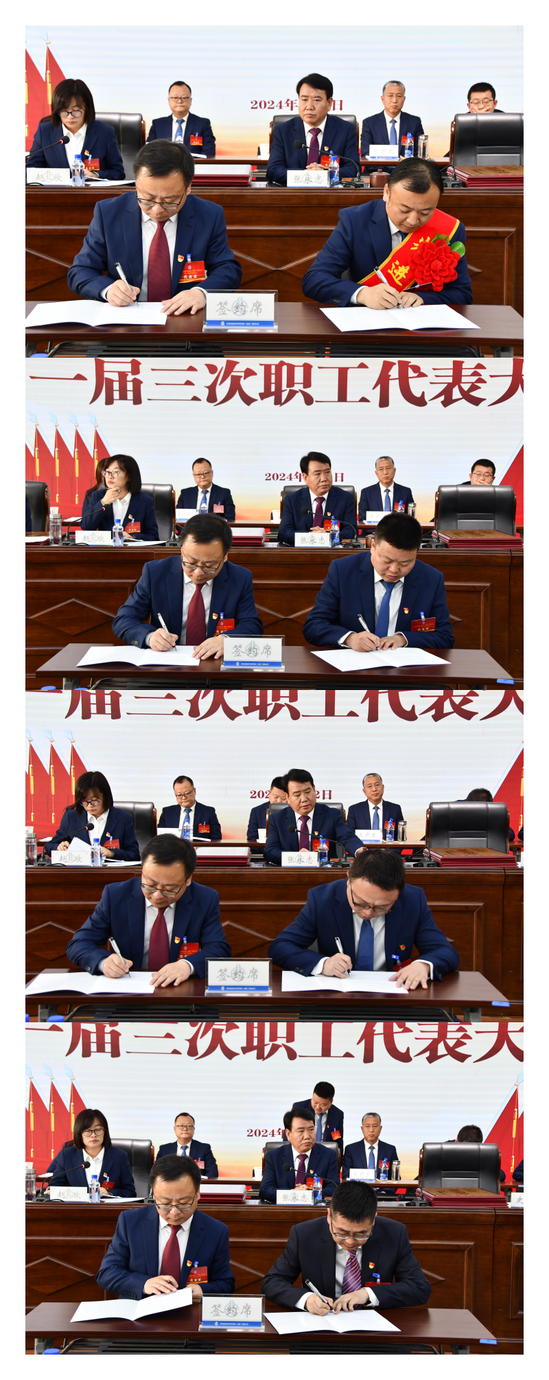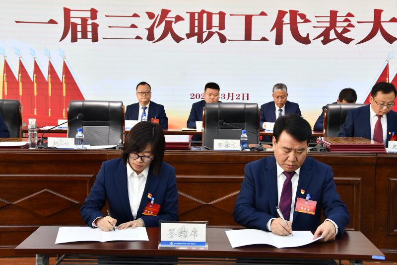 ▲大會簽署了《集體合同》《工資專項集體合同》《勞動安全衛(wèi)生專項集體合同》《女職工特殊權益保護專項集體合同》