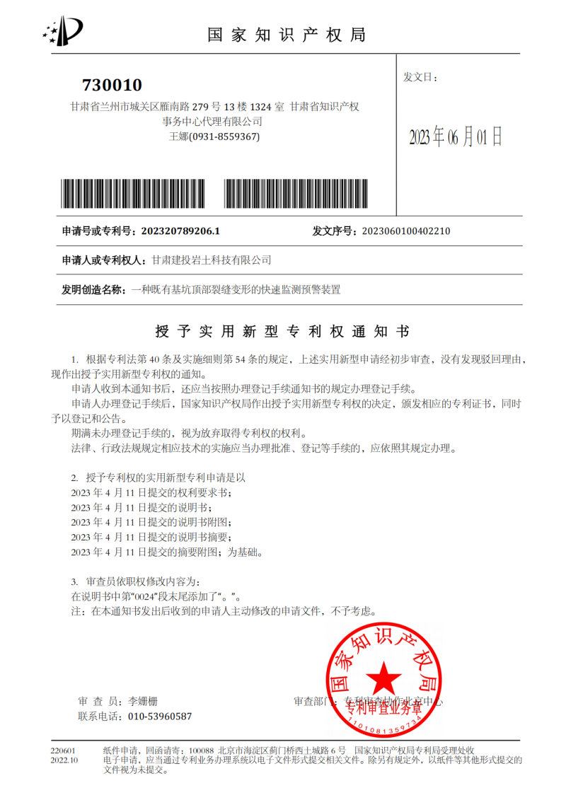 近日,由建投巖土科技公司申報的“一種既有基坑頂部裂縫變形的快速監(jiān)測預(yù)警裝置”和“一種降排水施工的自動化控制系統(tǒng)”兩項實用新型專利喜獲國家知識產(chǎn)權(quán)局授權(quán)。