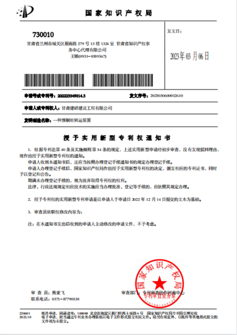 2023年一季度,經(jīng)國家知識(shí)產(chǎn)權(quán)局審核批準(zhǔn),建研建設(shè)公司申報(bào)的“一種梁粘鋼加固加壓裝置”“一種既有混凝土結(jié)構(gòu)增層節(jié)點(diǎn)”和“一種預(yù)制樁轉(zhuǎn)運(yùn)裝置”三項(xiàng)實(shí)用新型專利獲得授權(quán)。截止目前,建研建設(shè)公司已授權(quán)發(fā)明專利2項(xiàng)、實(shí)用新型專利20余項(xiàng),在審發(fā)明專利2項(xiàng)。
